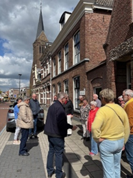 Niet alles ging over de Tweede Wereldoorlog. De deuren van het kleinste museum van Nederland werden voor ons geopend. Ook werd er bij het monument met de plattegrond van de oude stad verteld hoe Rijssen stadsrechten heeft gekregen. Telkens als we verder naar een volgend bezienswaardigheid liepen, praatten we onderling met veel plezier over wat we zagen of hoorden. We waren volop in beweging. Anderhalf uur hebben we gelopen, gestaan, geluisterd, herinneringen opgehaald en nieuwe verhalen gehoord in en over ons mooie Rijssen. Weer een geslaagde ledenmiddag!